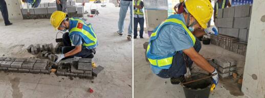 在实操比赛中,公司参赛选手精神抖擞,全神贯注于每个细节,以砖为具,以泥为料,心记要领,切砖、放线、摆砖、抹泥浆、目测、敲实……动作干净利落、墙面平整,工料完清,在规定时间内顺利完成了砌筑任务。