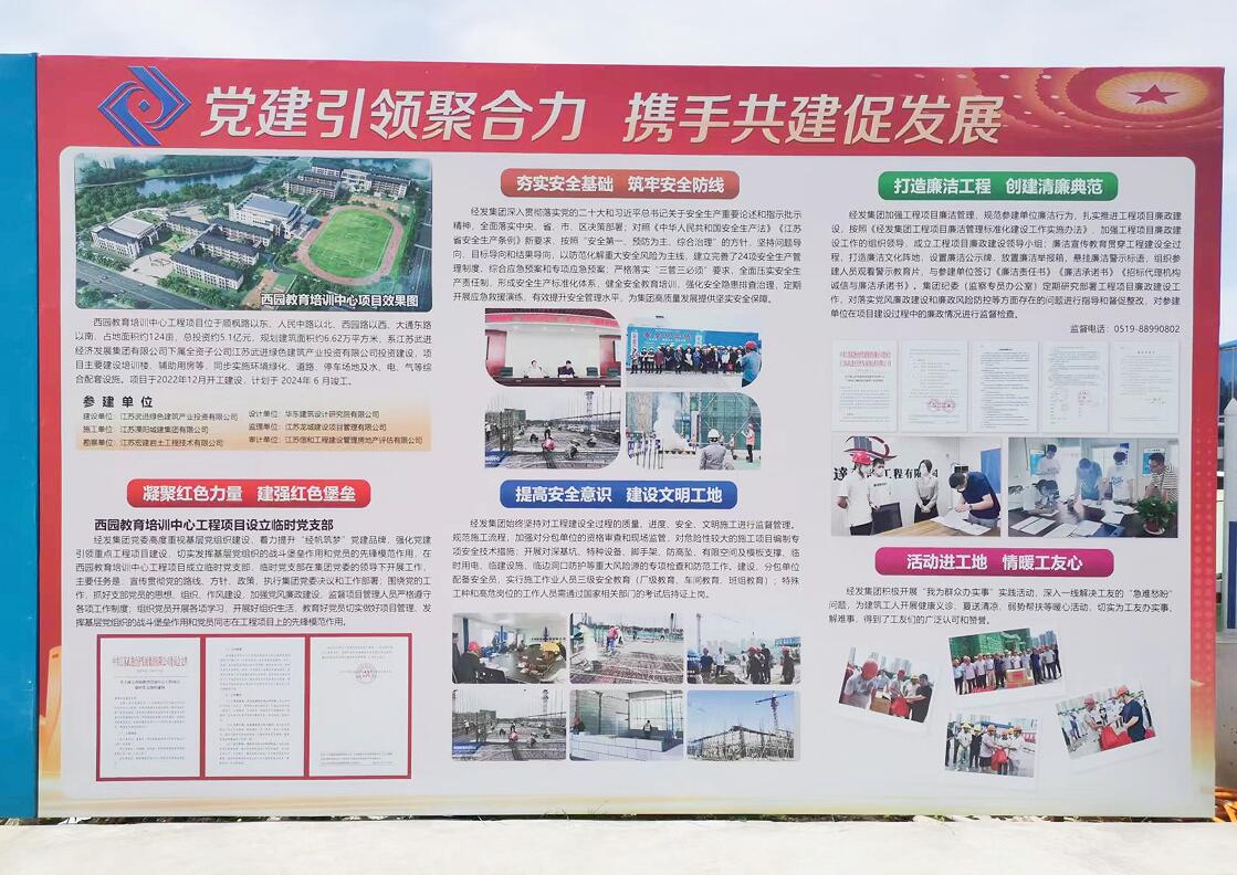 今年5月,为充分发挥党建引领作用,探索工程项目党建促廉建新路径,将红色党建与工程建设有机结合,大力推动“经帆筑梦”党建品牌与集团业务深度融合,集团下属全资子公司常州绿泰建设项目管理有限公司协同项目各参建主体成立了西园教育培训中心工程项目临时党支部,以“党建进工地”活动为载体,把支部建在项目上、把党旗插在工地上、把身份亮在岗位上,充分发挥党支部、党员在项目建设中的模范带头作用,推动党的建设和工程建设双融双促。