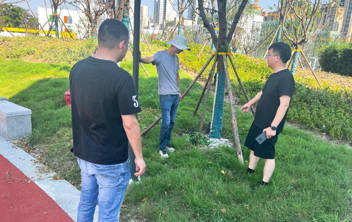 “这块石板缺了一块,想办法换一下”“这边透水陶瓷颗粒脱沙开裂了”“这里电缆裸露,存在安全隐患”“这边的绿化稀疏枯死,需要补种”“这里坡道的扶手还需要加固下”......项目现场上,找茬团分组行动,就项目的质量细节、施工及用材规范化、美观适用、用户体验等方面进行了“地毯式”检查,发现问题随手拍并上传到对应的项目微信群,同时现场与项目施工方探讨交流,对需要整改提升的地方提出针对性意见和建议。