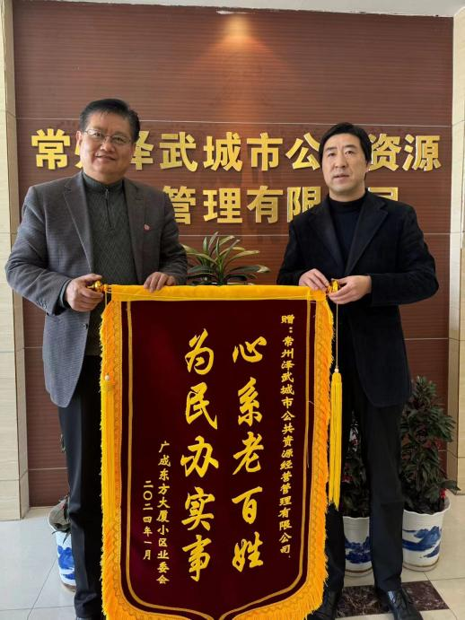 2024年1月16日下午,一面写有“心系老百姓,为民办实事,”的锦旗,由广成东方大厦小区业委会送到了常州泽武城市公共资源经营管理有限公司。