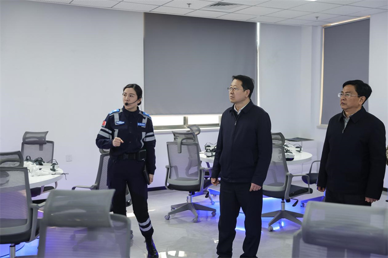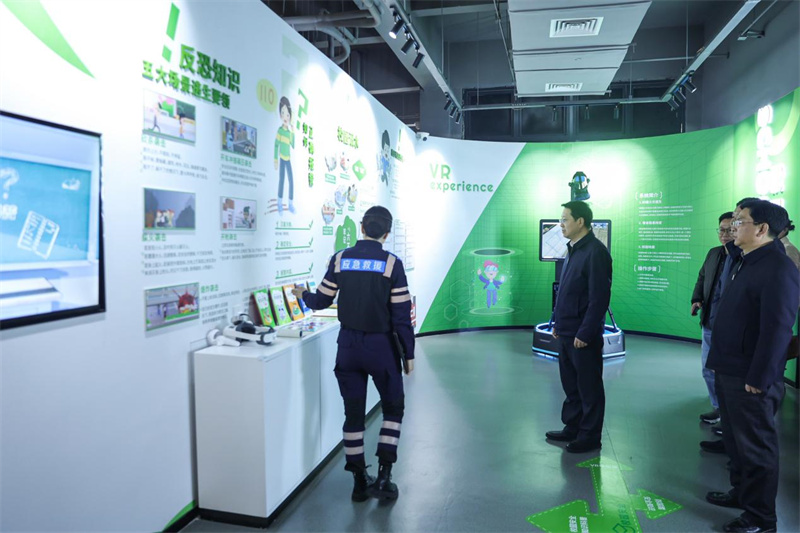 在听取基地建设运营情况后,调研组进入一层公共安全体验馆,依次参观消防安全、家庭安全、交通安全、校园安全(公共安全)、自然灾害、应急救护、公共卫生、新能源、应急装备展示、企业生产安全十大区域。在校园安全区,调研组仔细翻阅各学龄段订制化的《安全教育(武进版)》读本,详细了解应急、教育、消防等多部门协同编制的武进模式,一致认为该举富有教育意义又接地气,值得推广和借鉴。在二楼VR沉浸式交互教室和应急监管执法实训中心,调研组对新技术运用和虚拟化场景执法演练点赞,表示该平台将有效提高执法人员的综合素质和专业化水平。
