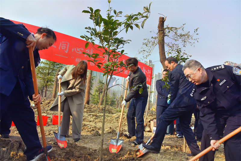 植树现场,“税警银企”单位相关负责同志齐心协力栽下了象征友谊团结奋进的树苗。
